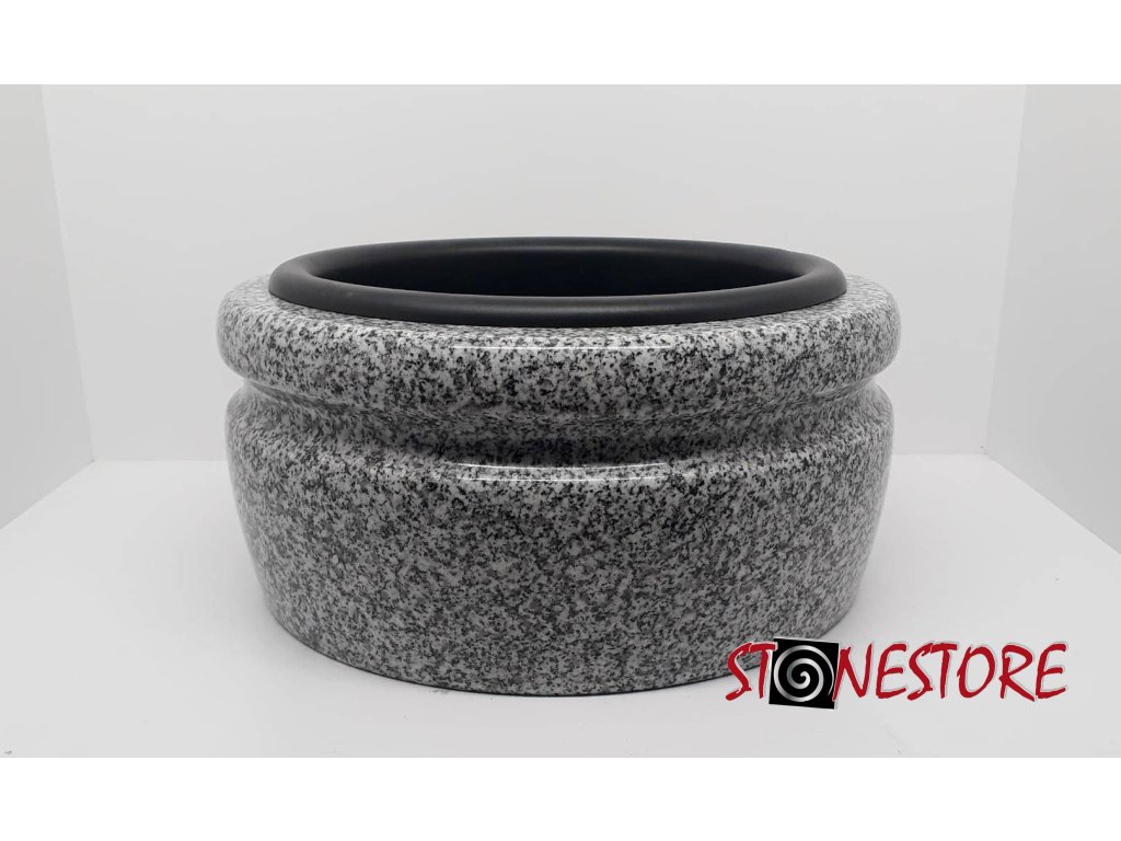 Die Granit-Grabschale ohne Boden (wie ein Ring) ist mit einem Kunststoffeinsatz versehen, der die Installation erleichtert und die Handhabung der Schale vereinfacht.